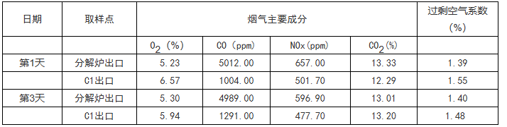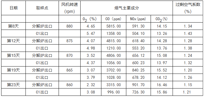 生产运维人员和操作人员协商采取循序渐进的方式降低转速,每次调整5rpm,且要保证系统稳定运行72小时以上,期间跟踪煅烧变化及熟料质量,每天测量窑尾烟气成分变化,烟气成分典型数据记录见下表: