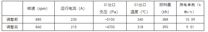 对于高温风机而言,仅仅从风机运行参数(转速、运行电流、C1出口负压、C1出口温度、投料量)和用电单耗,很难判断出用风的合理性,只是凭经验判断,C1出口温度有所偏高,系统用风应该存在富余,但缺乏理论依据。