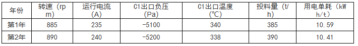 总得来说,经企业人员在近一个月内的调整,高温风机转速由885rpm逐渐降至860rpm,经企业生产运维工程师确认,烧成系统运行正常,台时产量、熟料质量未受到影响。高温风机吨熟料用电单耗由10.59kWh降为9.51kWh,每年可节约用电170万kWh,年节约电费近百万元。