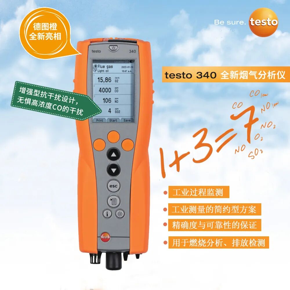 testo 340 是一款操作极其简便的紧凑型四组分烟气分析仪。可帮助用户对工业燃烧设备进行精准的排放测量。仪器可安装四个气体传感器,采样探针群丰富。testo 340标配O2传感器,并可任意选择三个气体传感器CO,COlow,NO,NOlow,NO2,O2,满足各种不同应用中的测量需求,提供了传感器的自由选择空间。标配量程扩展功能,在高浓度烟气测量应用中无需再为传感器量程不够而烦恼(比如在工业烟气分析过程中)。量程扩展功能(稀释)在突发烟气浓度过高情况下自动启动,无需额外高浓度传感器。testo 340 手持式烟气分析仪的紧凑型设计及专业可靠的技术背景确保其便携性及精确性,适用于各种工业烟气分析及排放检测应用: